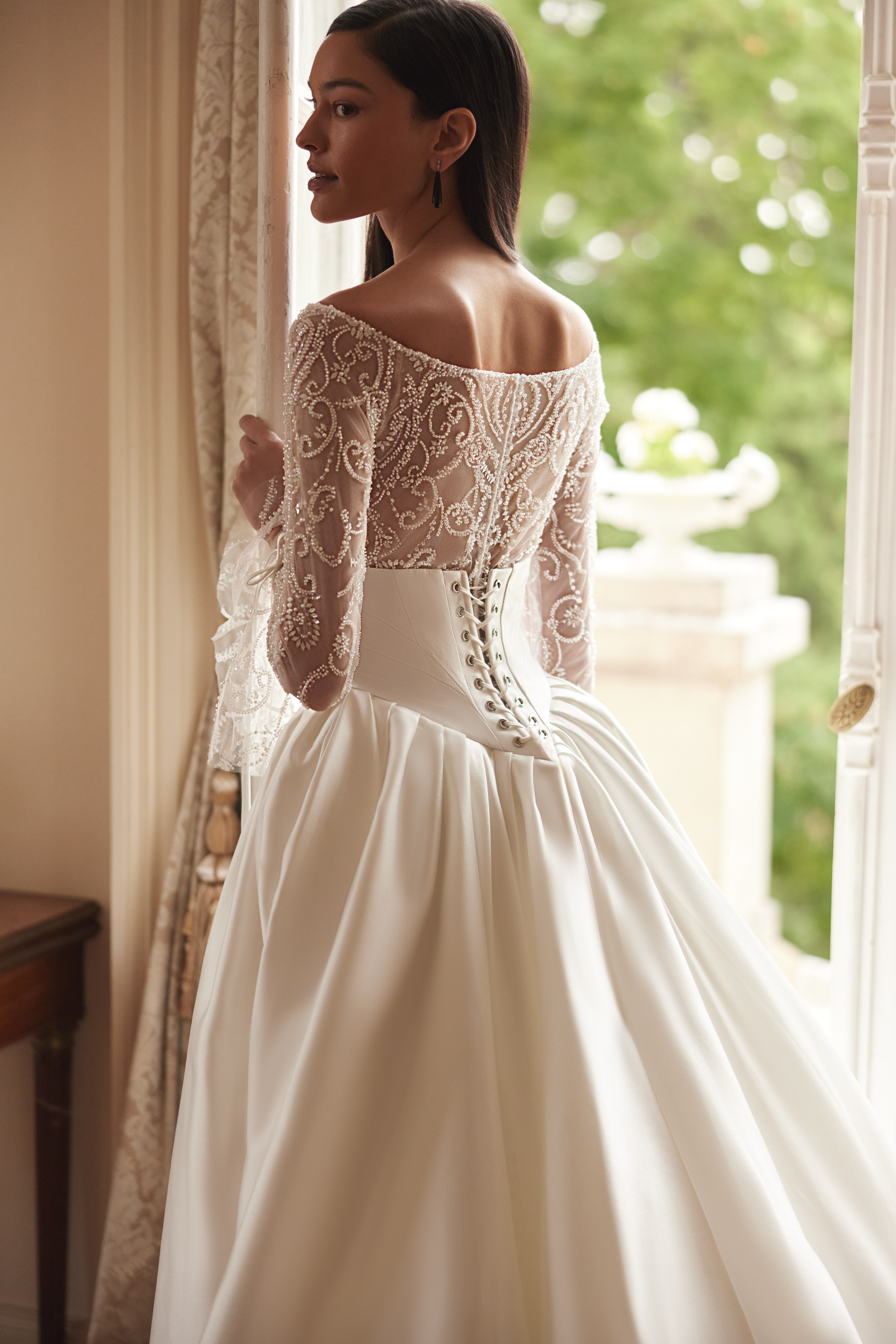 A balance between delicacy and luxury: the lace bodice brings fragility, the skirt adds volume and grandeur, while the ruffles on the sleeves infuse character.