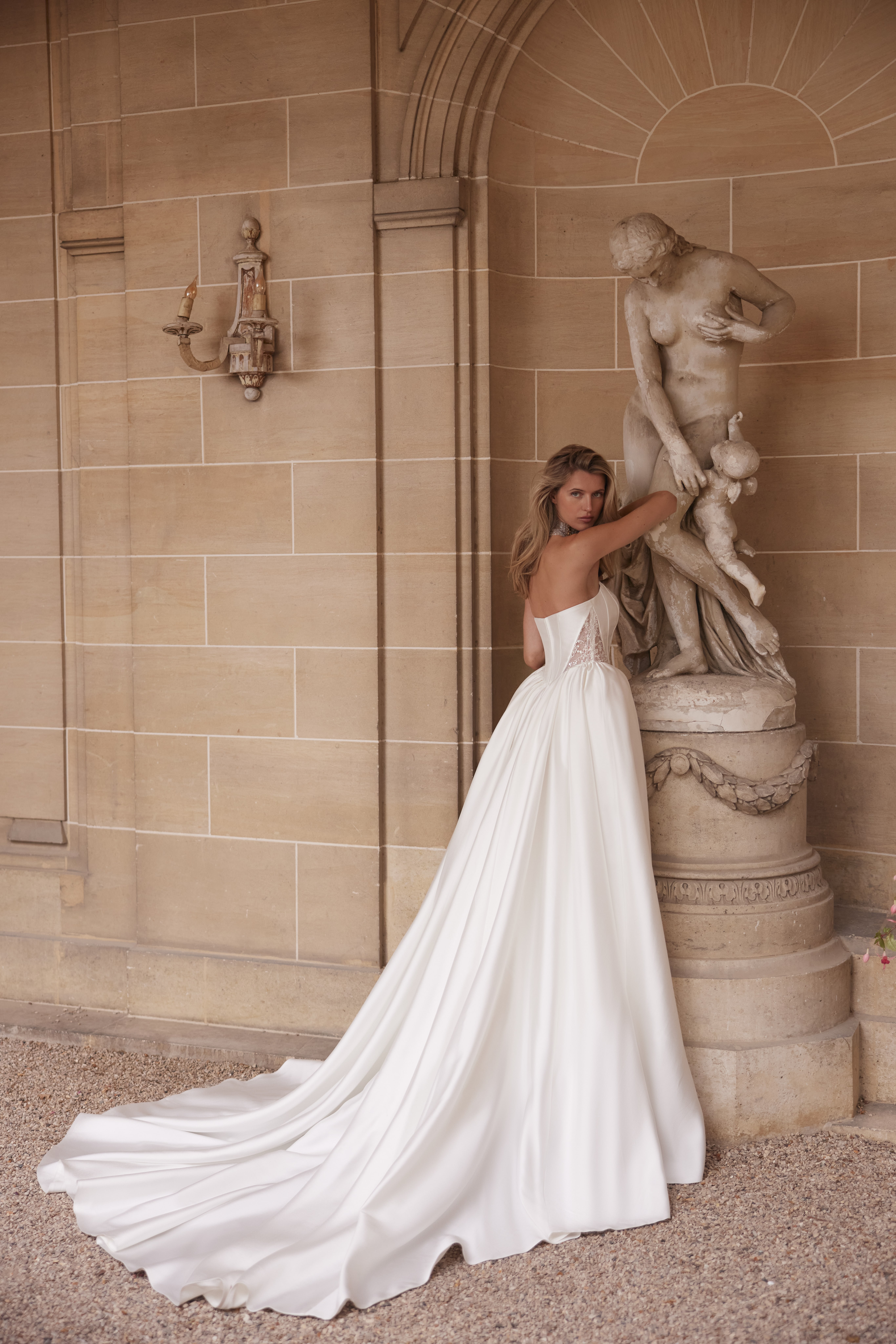 A corset with delicate beaded embroidery flows seamlessly into a voluminous skirt, shaping a silhouette of solemn harmony. This gown is where every detail resonates like a refined note, composing a complete melody of grandeur and beauty.
