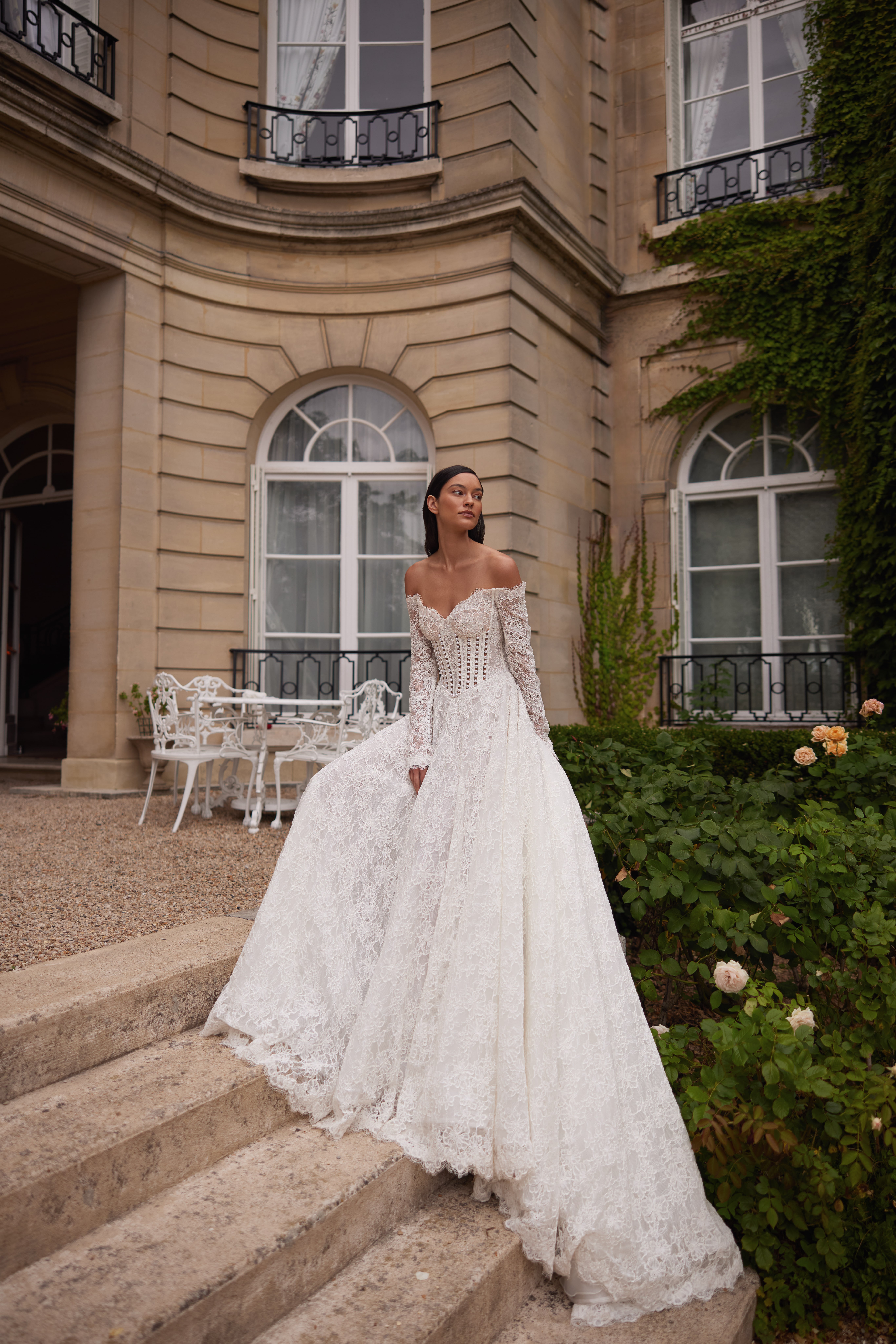 A voluminous gown covered in lace patterns that seem to conceal a secret within. It creates the image of enigmatic aristocracy, one that invites to be unraveled.