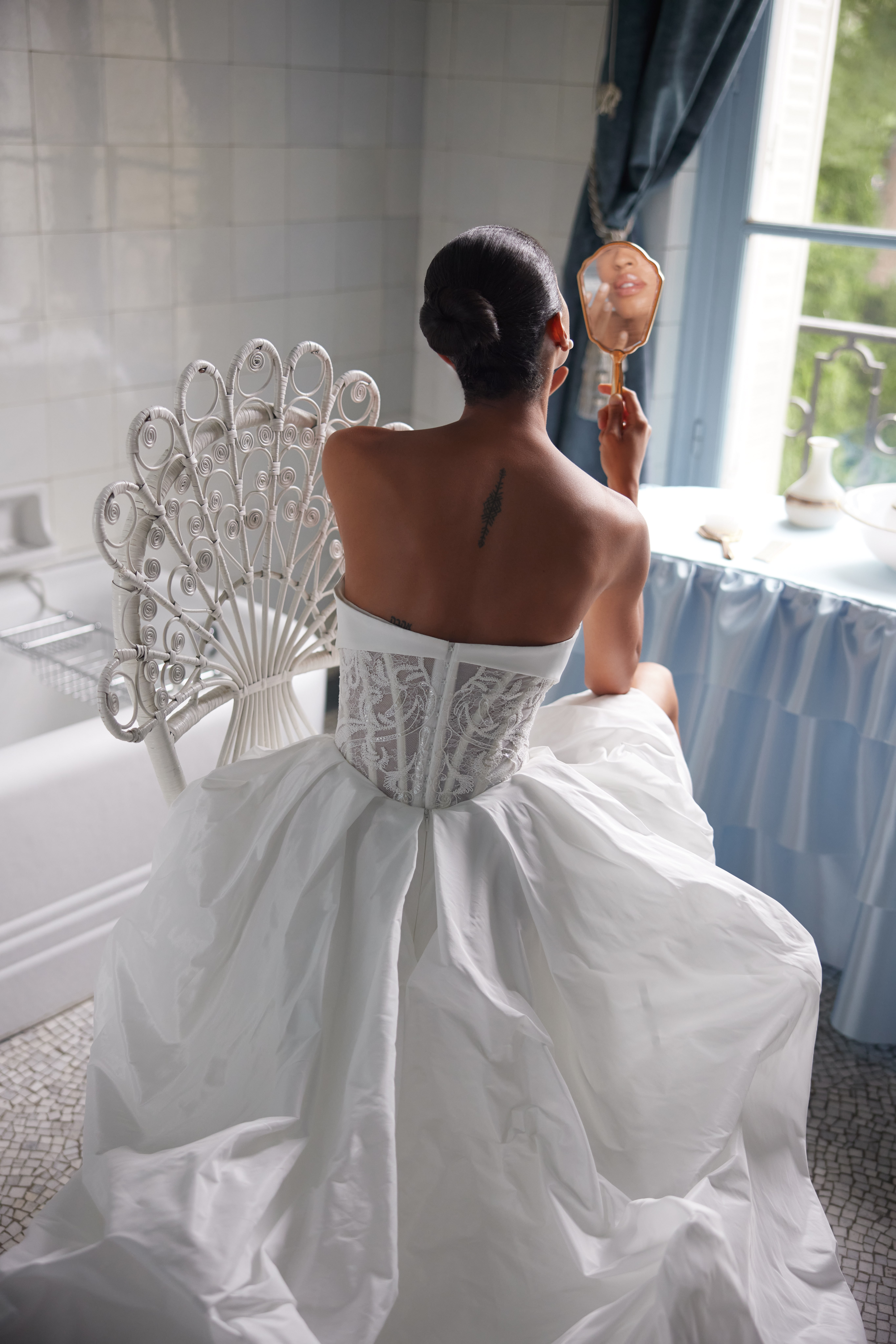 A dress with character. It carries both grace and a touch of playful defiance: the long voluminous train creates solemnity, while the silhouette boldly reveals the beauty of the legs. This is the image of a woman who unites majesty and freedom, rules and challenges.