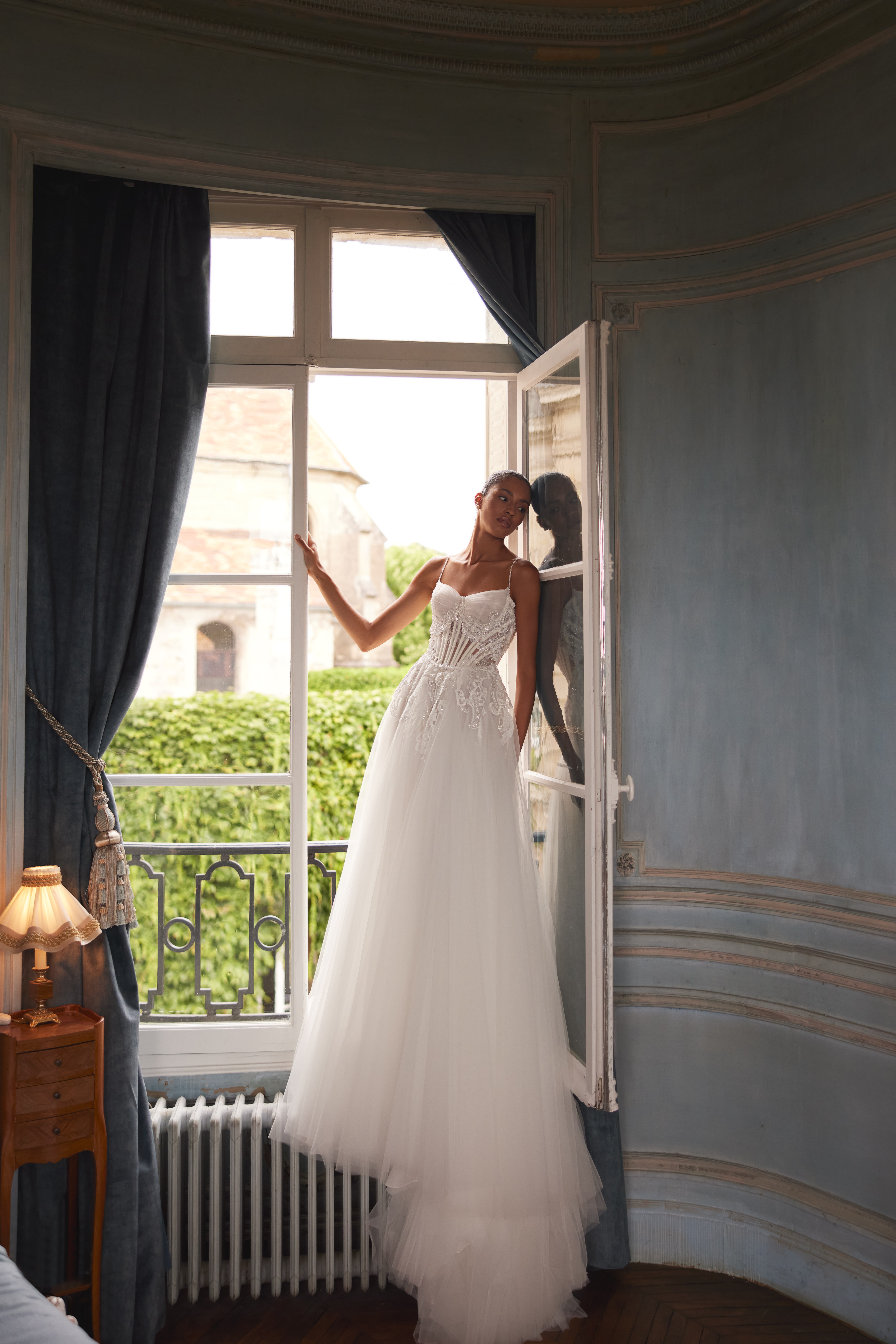 A gown that resonates like the melody of a ball. The corset part gently releases embroidered elements onto the skirt, creating a sense of both lightness and solemnity.